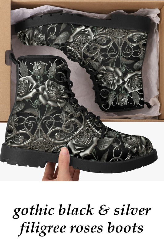 Gothic Black & Silver Filigree Roses Women's Boots, FREE Shipping