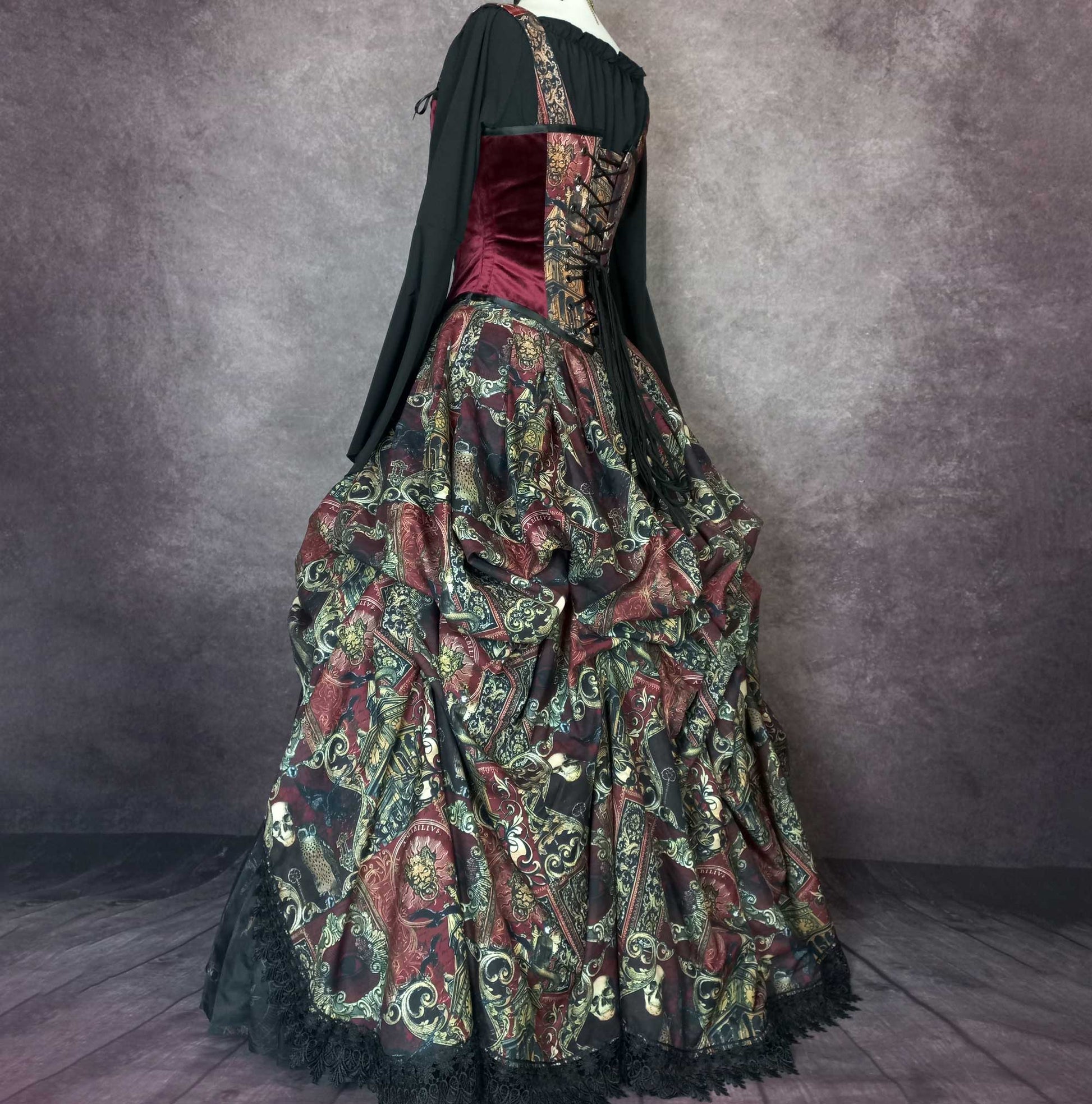 The skirt of Masquerade is a three layered set consisting of an outer skirt with delightful draping and romantic braid trim. The unique BOTC themed fabric matches that of the corset. It is designed to show off the Majestica under skirt which features a darker toned custom fabric full of game icons and symbols familiar to players of the game.