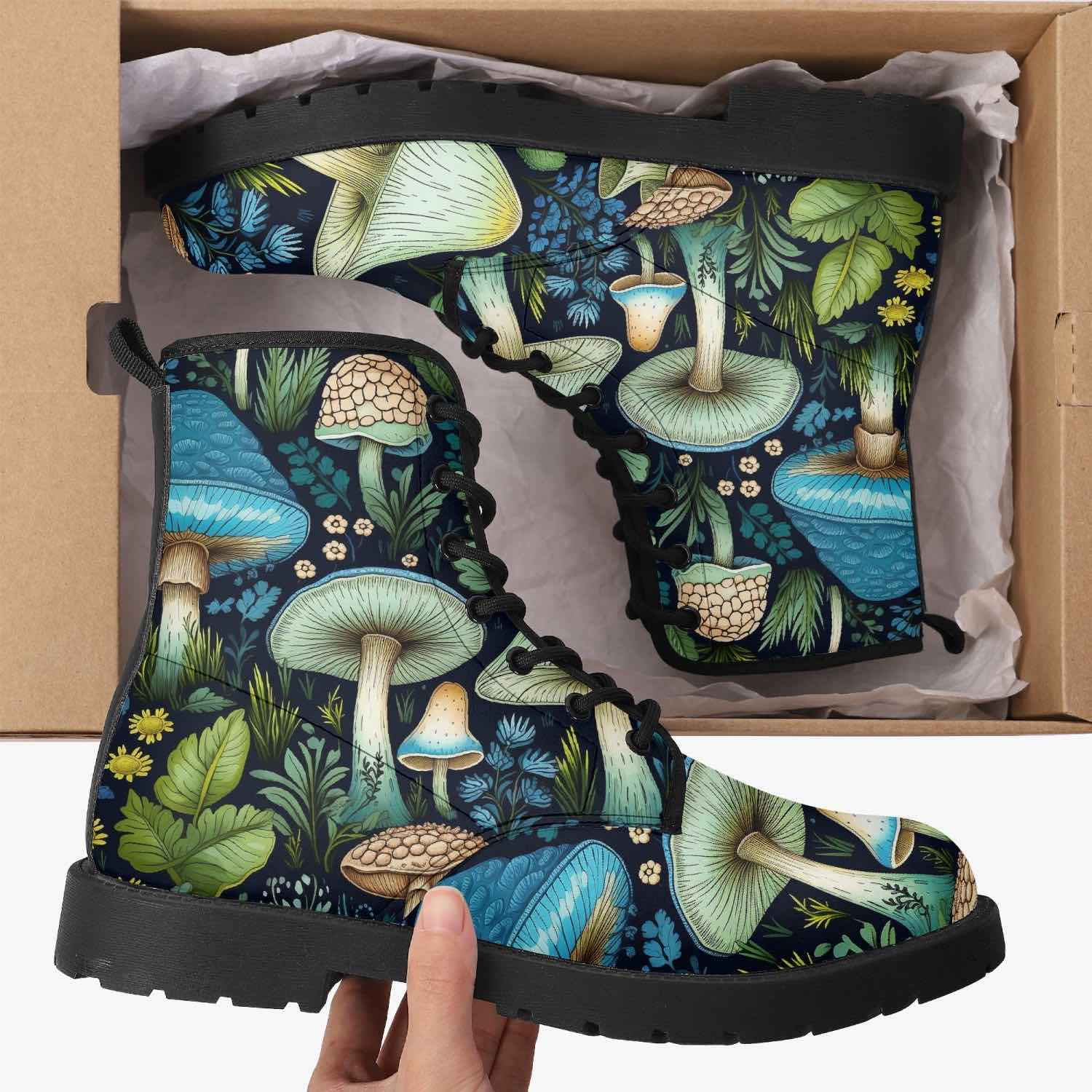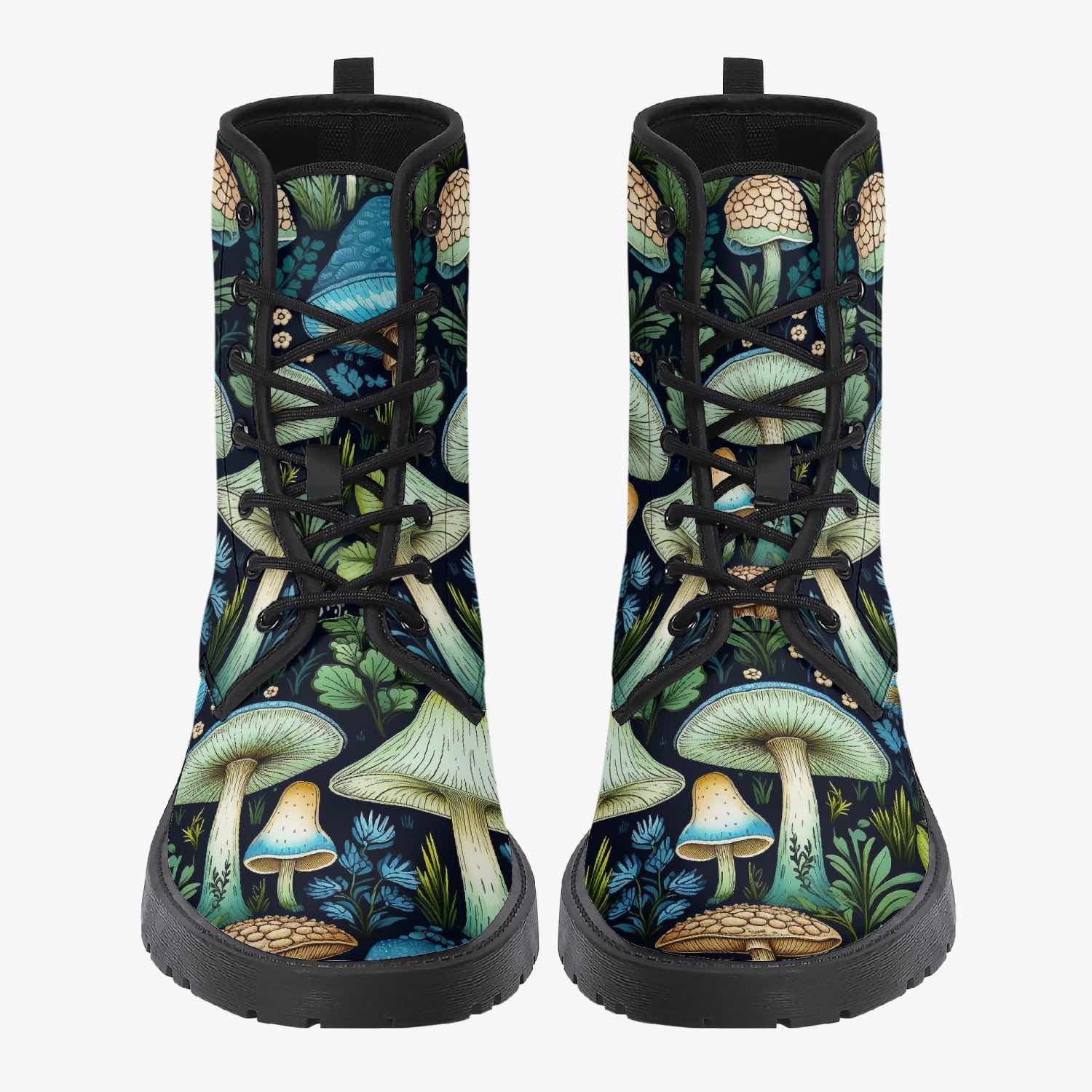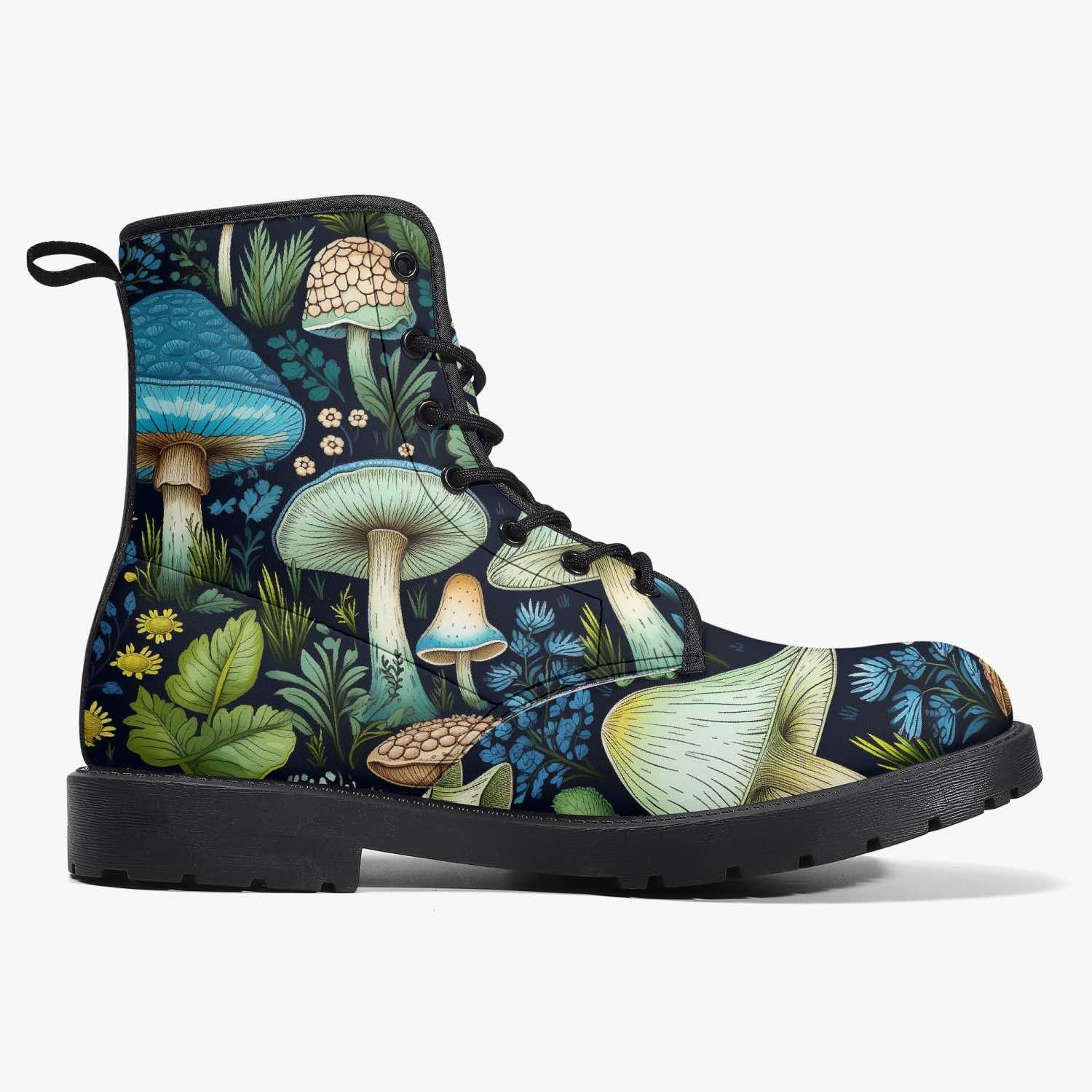 Fairy and Mushroom Core themed boots in beautiful blues and greens. A vibrant Toadstool forest custom printed on high quality vegan leather lace up combat boots. Custom printed and then carefully handcrafted into these extra comfortable combat style boots made from faux/synthetic leather.