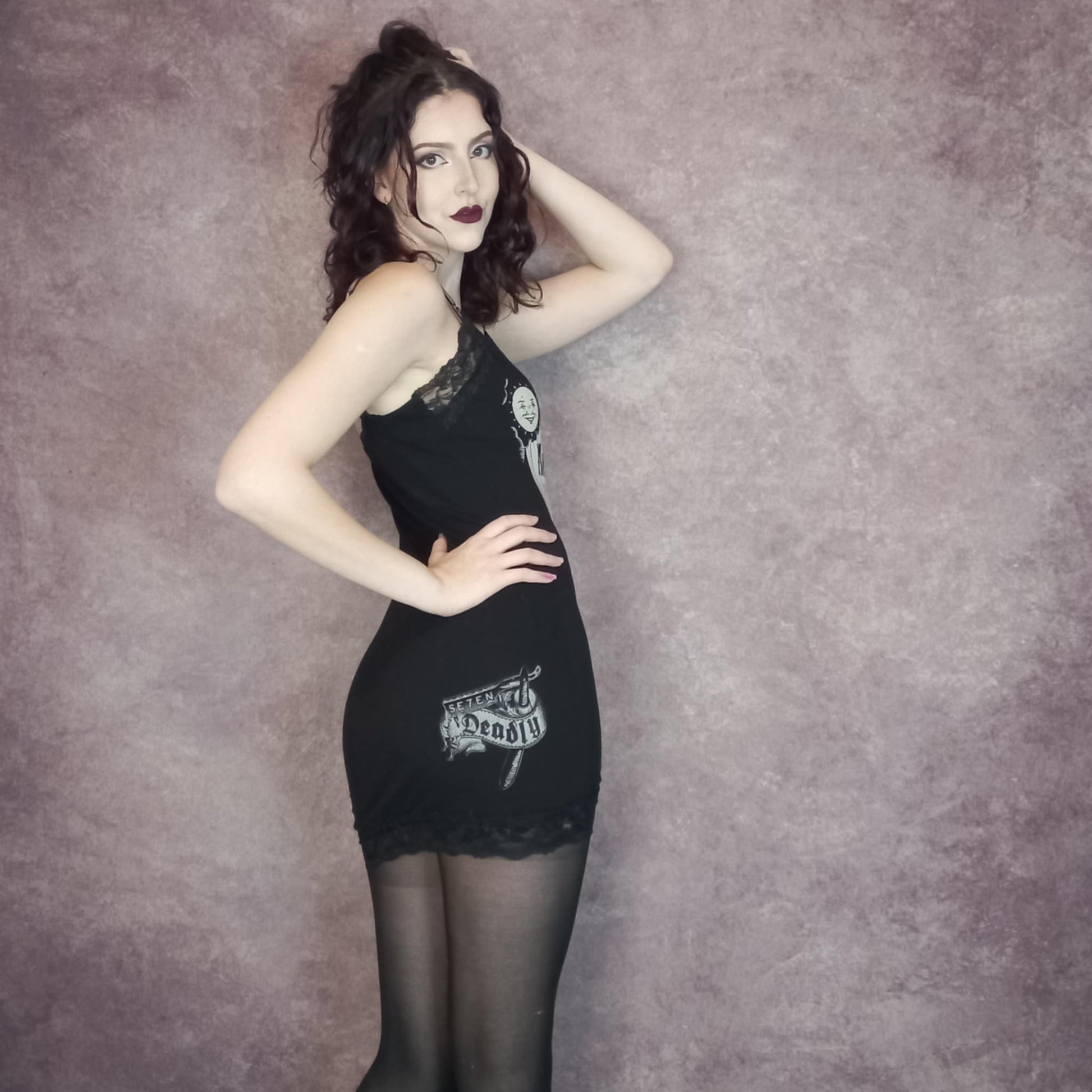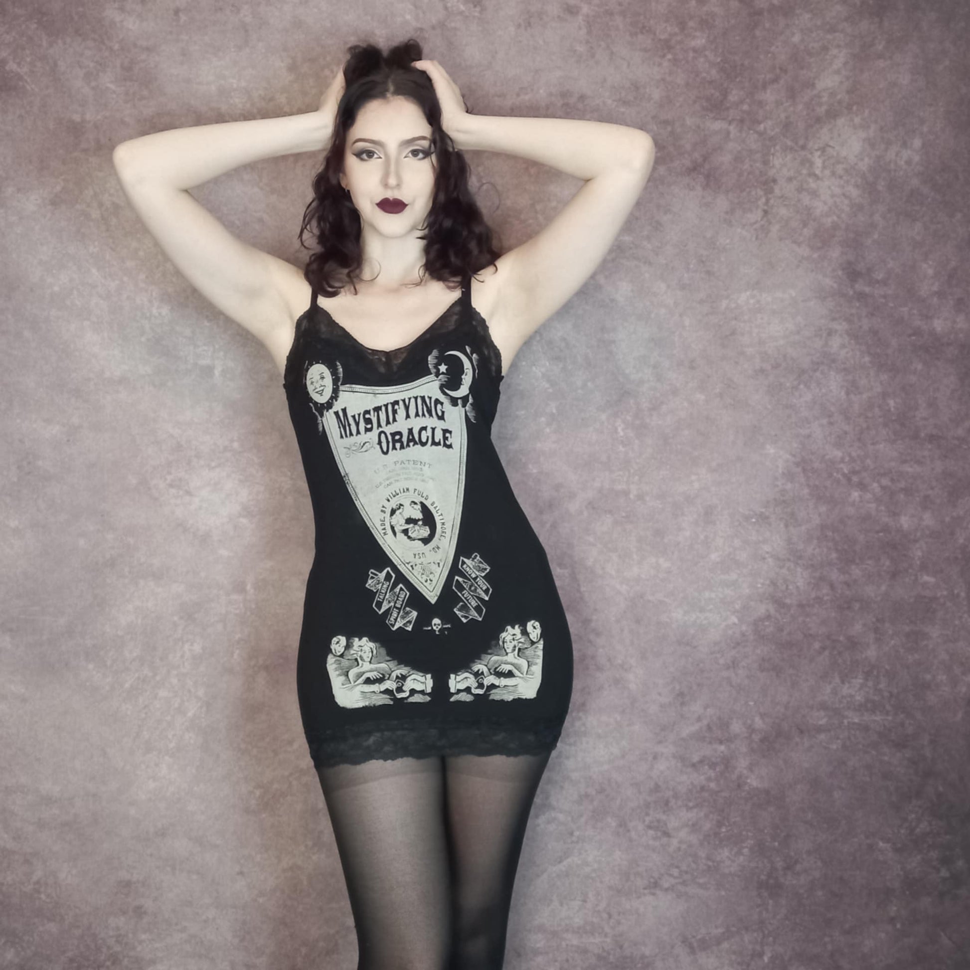 Unique Cotton Cami singlet dress featuring the famous 'Mystifying Oracle' Vintage Ouija Board print from the darkly alternative creators over at Se7en Deadly in California.