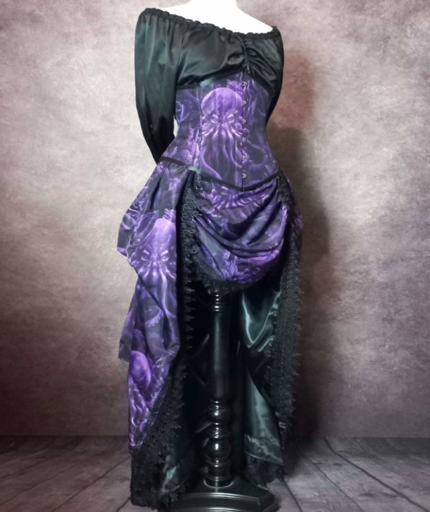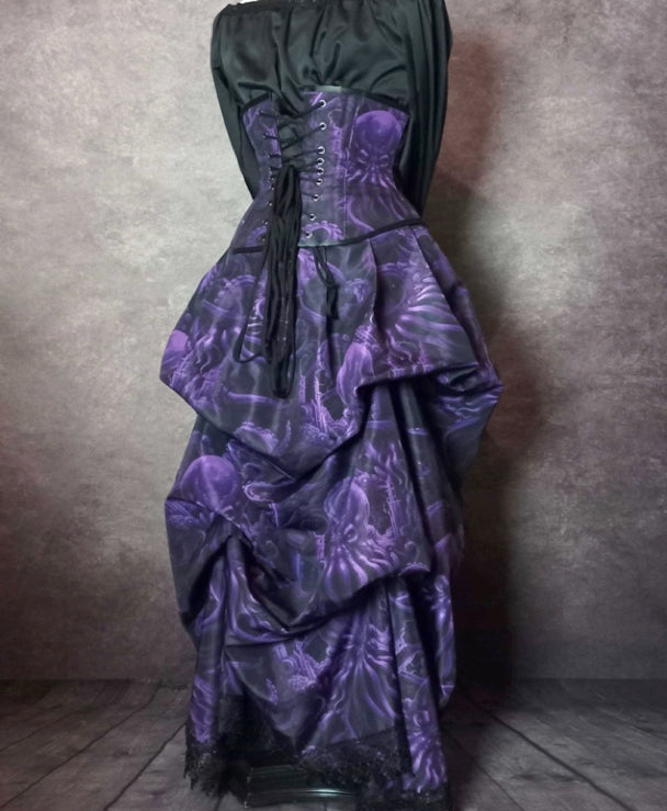 Introducing the Purple Monster of the Deep Cthulhu Corset Bustle Gown Set, perfect for gothic and Victorian enthusiasts. This five-piece set, featuring a comfortable under bust corset and custom designed fabric, can be worn individually or mixed and matched for a unique look. Made to measure and steel boned for a flattering fit on all sizes. Perfect for gothic weddings, festivals, and embodying the legend of the monster of the deep. Handcrafted in Australia with a touch of HP Lovecraft inspiration.